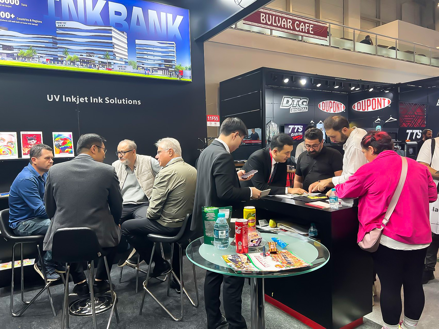 在2025年伊斯坦布尔广告标识展览会上,墨库的展位由如歌展览专业团队打造。空间布局:展台前方设置品牌形象接待台,作为视觉焦点与客户第一接触点,强化品牌认知。 展示区:左侧墙面展示墨水解决方案的实物与应用案例,直观呈现产品效果;右侧墙面通过展架、屏幕展示UV墨水解决方案等系列产品,搭配宣传册陈列,便于客户深入了解; 背景墙面以图文结合的方式,突出“绿色喷墨、智能应用、零妥协”等产品理念与技术优势。洽谈区:中间区域设置多组圆形洽谈桌与高脚椅,营造开放、舒适的交流空间,方便业务洽谈与客户互动。主色调采用黑色,体现高端、专业与科技感,契合喷墨墨水制造行业的技术属性,同时为品牌元素和产品展示提供沉稳的背景支撑。 辅助色以白色和红色为主,白色增强空间的简洁感与明亮度,红色作为品牌视觉符号的核心,形成强烈视觉冲击,有效提升品牌辨识度,让“INK BANK”的标识在黑色基调中尤为突出。整体色彩搭配简洁且富有层次,既凸显专业质感,又强化了品牌记忆点。